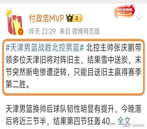 北控输天津赛后,著名媒体人付政浩在社媒上点评了本场比赛。“北控主帅张庆鹏带领多位天津旧将对阵旧主,结果雪中送炭,末节突然断电惨遭逆转,只能目送旧主赢得赛季第二胜。”;“天津男篮换帅后,球队韧性明显有提升,今晚落后将近三节半,结果第四节狂轰40分,生生逆转北控……相比之下,北控末节明显有些慌乱无措。”。