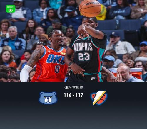 第四节灰熊考沃德拿下6分,雷霆杰伦-威廉姆斯拿下12分,最终灰熊116-117不敌雷霆