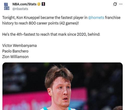 凭借这样的表现,克努佩尔仅花费42场比赛就拿到800分,创造黄蜂队史最快纪录,也是NBA2020年以来第四快,仅次于文班亚马、班凯罗与锡安三人。