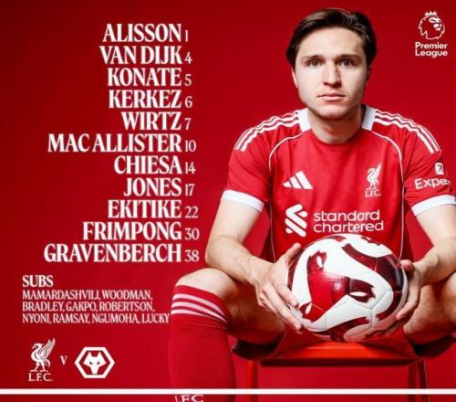 英超第18轮,利物浦主场迎战狼队,赛前利物浦首发阵容已经出炉,具体名单如下: 利物浦首发:阿利松 / 弗林蓬、科纳特、范戴克、凯尔凯兹 / 赫拉芬贝赫、柯蒂斯·琼斯 / 费代里科·基耶萨、麦卡利斯特、维尔茨 / 埃基蒂克